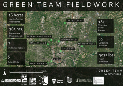 This summer, Groundwork Ohio River Valley (ORV) continued its mission of building a more equitable and sustainable Cincinnati region—by investing in the power of youth. Through the Green Team Program, Groundwork ORV employed 98 high school youth (ages 14–18) and 19 young adult leaders, who worked on the front lines of environmental restoration and community resilience.